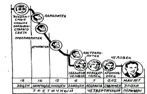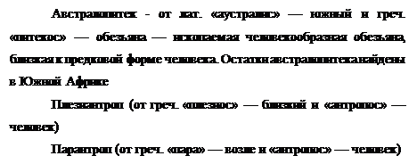 В конце третичного периода истории Земли, на протяжении пяти-шести миллионов лет, предки человека прошли в своем развитии стадию так называемых австралопитеков, плезиантропов — ископаемая африканская человекообразная обезьяна, в анатомическом отношении очень сходная с человеком) и парантропов — ископаемая человекообразная обезьяна, жившая в Африке, близкая по строению тела к человеку). Эти прямоходящие человекообразные обезьяны все более и более приближались в своем физическом развитии к обезьяне-человеку, превратившись в самом конце третичного периода в обезьяно-людей—питекантропов (от греч. «питекос»— обезьяна и «антропос» — человек).