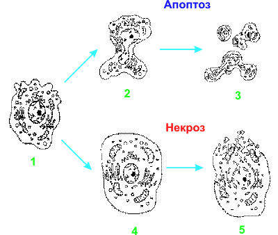 Рис. 1. Изменение ультраструктуры клеток животных при некрозе и апоптозе. 1 – нормальная клетка, 2 – апоптотическое сморщивание клетки с образованием пузырчатых выростов, 3 – фрагментация клетки с образованием апоптотических везикул, 4 – набухание клетки при некрозе, 5 – некротическая дезинтеграция клетки