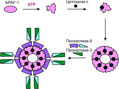 и dATP или АТР. Из этих субъединиц собираются жесткие, симметричные структуры, наподобие веера или пропеллера .APAF-1 играет роль арматуры, на которой происходит аутокаталитический процессинг каспазы-9 . Предполагается, что в результате зависимого от гидролиза dATP (или АТР) конформационного изменения APAF-1 приобретает способность связывать цитохром с