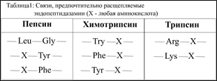 В желудочно-кишечном тракте пищевые белки распадаются на аминокислоты при участи пищеварительных протеолитических ферментов – пептидогидролаз. Эта группа ферментов различающихся по субстратной специфичности: каждый из этих ферментов предпочтительно (т.е. с наибольшей скоростью) гидролизует пептидные связи (рис.1), образованные определёнными аминокислотами. В результате совместного действия всех пищеварительных пептидогидролаз белки пищи полностью распадаются на аминокислоты. Таким путём организм получает мономеры для синтеза собственных белков.