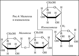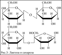 Из тех глюкозных остатков, которые в молекуле крахмала соединены 1,6-гликозидной связью, образуется дисахарид изомальтоза. Кроме того, с пищей в организм поступают дисахариды сахароза и лактоза (рис.3), которые гидролизуются специфическими гликозидазами – мальтазой, изомальтазой, лактазой и сахаразой соответственно.