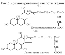 В составе желчи содержатся коньюгированные желчные кислоты (Рис.5) – гликохолевая и таурохолевая. Эти кислоты обладают амфифильными свойствами. На поверхности раздела жир-вода они ориентируются таким образом, что гидрофобная циклическая часть оказывается погружённой в жир, а гидрофильная боковая цепь – в водную фазу. В результате образуется стабильная эмульсия.