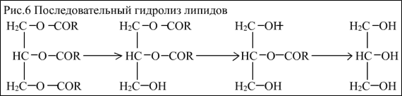 Под действием липазы идёт гидролиз жиров, в ходе которого жирные кислоты отщепляются от триацилглицерина одна за другой, сначала от α-углеродных атомов, потом – от β-углеродного атома (Рис. 6)