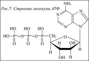 Освобождение значительной энергии при гидролизе дало основание ввести специальный термин для фосфоорганических веществ – макроэнергетические. Молекула АТФ содержит две высокоэнергетические (макроэнергетические) связи (рис.7).