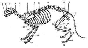 Анатомічна будова кісткової системи: 1— лицьова частина; 2— нижня щелепа; 3— черепна частина; 4— перший шийний хребець; 5— шийні хребці; 6— лопатка; 7— грудні хребці; 8— ребра; 9— поперекові хребці; 10— крижі; 11— таз; 12— хвостові хребці; 13— стегнова кістка; 14— велика і мала гомілкова кістки; 15— плесно; 16— пальці (лапа); 17— пясть; 18— променева і ліктьова кістки; 19— плечова кістка; 20— грудна кістка.