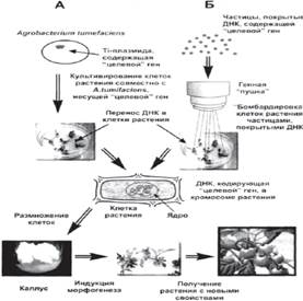 «Целевой» ген, способный изменять то или иное свойство растения, встраивается генно-инженерными методами в Ti–плазмиду, которая, затем переносится в агробактерию. В процессе совместного культивирования агробактерии и культуры клеток растения – хозяина Ti–плазмида попадает в клетки растений, а «целевой» ген с дополнительными фрагментами ДНК встраивается в растительный геном. Каждая такая клетка может быть, затем регенерирована в целое трансгенное растение, которое будет содержать генетическую информацию из двух или нескольких различных организмов. Это метод применяется для трансформации двудольных растений.