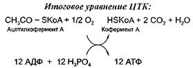 Чаще всего водород отнимается от промежуточных продуктов цикла трикарбоновых кислот - цикла Кребса. Цикл Кребса - это завершающий этап катаболизма, в ходе которого происходит окисление ацетилкофермента А до С02 и Н20. В ходе этого процесса от перечисленных выше кислот отнимается 4 пары атомов водорода и поэтому образуется 12 молекул АТФ при окислении одной молекулы ацетилкофермента А.