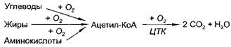 В свою очередь, ацетил-КоА может образовываться из углеводов, жиров и аминокислот, т.е. через ацетил-КоА в цикл Кребса вовлекаются углеводы, жиры и аминокислоты: