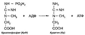 В мышечных клетках всегда имеется креатинфосфат - соединение, содержащее фосфатную группу, связанную с остатком креатина макроэнергической связью. Содержание креатинфосфата в мышцах в покое - 15-20 ммоль/кг. Креатинфосфат обладает большим запасом энергии и высоким сродством к АДФ. Поэтому он легко вступает во взаимодействие с молекулами АДФ, появляющимися в мышечных клетках при физической работе в результате гидролиза АТФ. В ходе этой реакции остаток фосфорной кислоты с запасом энергии переносится с креатинфосфата на молекулу АДФ с образованием креатина и АТФ: