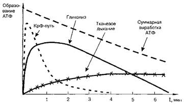 При кратковременной, но очень интенсивной работе главным источником АТФ является креатинкиназная реакция, при более продолжительной интенсивной работе большая часть АТФ образуется гликолитическим путем. При выполнении упражнений большой продолжительности, но умеренной мощности энергообеспечение мышц осуществляется в основном за счет аэробного окисления.