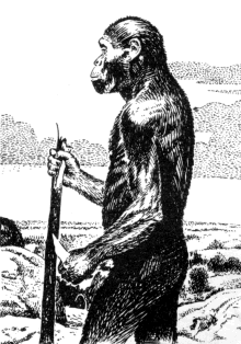 В интервале 20-9 млн. лет. назад найдено много остатков человекообразных обезьян. Ещё в прошлом веке из миоценовых слоёв Европы первым был описан дриопитек ( от греч. слов и «дрис» - дерево, «питекос» - обезьяна). При передвижении по деревьям эти обезьяны цеплялись за ветви, подвешиваясь к ним руками, туловище при этом находилось в отвесном положении, а ноги были поджаты. У дриопитековых были особенности, позволявшие им идти по пути антропогенеза: высокое развитие центральной нервной системы, хорошее цветное бинокулярное зрение и хватательные конечности – не только передние, но и задние. Способность к передвижению на двух ногах, или к прямохождению, очень пригодилась предкам человека, когда на Земле стал сильно меняться климат. Великий русский физиолог И. Павлов выделял обезьян среди др. животных. Благодаря 4 хватательным конечностям у обезьян складываются более разнообразные взаимоотношения с окружающей средой. Это, в свою очередь, развивает мышечное чувство, осязание, зрение: обезьяны видят предметы в объёме и цвете. (см.1, стр.57) Среди более развитых обезьян, вроде южноафриканских или восточноафриканских австралопитеков (от лат. «австралис» - южный и греч. «питекос» - обезьяны) была, очевидно, та порода человекообразных, о которой Ф.Энгельс говорил, что она «далеко превосходила все прочие смышленостью и приспособляемостью». Термин «австралапитек ввёл английский анатом Р.Дарт, нашедший в 1924 г. на территории ЮАР череп шестилетнего детёныша этой полуобезьяны получеловека. После находки Дарта останки австралопитеков в большом количестве были найдены не только в южной, но и Центральной Африке. Австралопитек Дарта жил поздно – около миллиона лет назад и потому не мог рассчитывать на роль нашего предка. Сейчас время становления австралопитеков относят к периоду от 9 до 5 млн. лет назад. Эти обезьяны были прямоходящими. Для чего они высвободили руки? Наиболее подходящее объяснение: австралопитеки уже пользовались орудиями: палками, дубинами, камнями, крупными костями антилоп. Но австралопитеки были предлюдьми, т.к. их орудия ещё не обладали достаточным постоянством формы типа человеческих и поверхность их черепа гладкая, как и у всех человекообразных обезьян. А к виду древнейших людей относятся питекантропы , т.к. они стали регулярно изготовлять орудия, правильно их использовать при добывании пищи и в обороне от врагов.