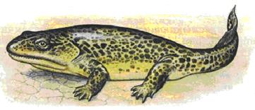 Древнейшие земноводные - ихтиостеги - обитали в верхнем девоне около 300 - 320 миллионов лет назад. Эти примитивные амфибии сохраняли еще очень много исходных и даже общих черт (признаков) с кистеперыми рыбами (Рис. 1, 2). Поэтому происхождение земноводных от кистеперых рыб не подлежит никакому сомнению. Изобилие и процветание этих животных было отмечено в карбоне, триасе и кайнозое, когда они были представлены множеством разнообразных форм. В то же время в юрском и меловом периодах произошло замедление их развития, уменьшилась численность и видовое разнообразие. Однако, начиная с верхнего карбона (в палеозое) и до конца триаса (в мезозое) амфибии первенствовали в тогдашней фауне.
