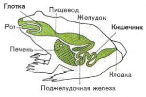 Состоит из ротовой полости, глотки, пищевода, желудка и кишечника (Рис. 4). У земноводных более развит желудок, а в кишечнике заметно выделяется двенадцатипёрстная, тонкая и толстая кишки. В двенадцатипёрстную кишку открываются протоки печени вместе с протоком желчного пузыря, в который открываются протоки поджелудочной железы. В тонкой кишке происходит окончательное переваривание пищи и всасывание в кровь питательных веществ. В толстой кишке скапливаются не переваренные остатки пищи. Толстая кишка заканчивается прямой кишкой, называемой клоакой. Сюда же открываются мочевой пузырь (обороняясь, лягушка может выпустить струю скопленной мочи), мочеточники и яйцеводы (у самок).