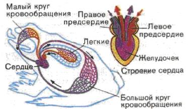 В связи с наличием лёгких кровеносная система у земноводных имеет более сложное строение, чем у рыб (Рис. 7). Сердце земноводных состоит из трёх камер: двух предсердий и одного желудочка. Кровь из всех органов собирается в вены и поступает в правое предсердие. В этой крови содержится много углекислого газа и питательных веществ, поступающих из кишечника. В левое предсердие приходит кровь из лёгких. Она богата кислородом.