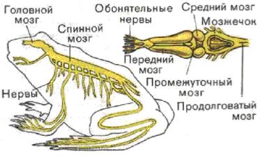 Мозг земноводных имеет простое устройство (Рис. 8). Он имеет удлинённую форму и состоит из двух передних полушарий, среднего мозга и мозжечка, представляющего лишь поперечный мостик, и продолговатого мозга. У земноводных сильнее развит передний мозг (далее в эволюции будет наблюдаться именно развитие переднего мозга), но ещё нет коры головного мозга, серого вещества, нервные клетки рассеяны по всей поверхности. Слабее мозжечок. Слабое развитие мозжечка связано с однообразием двигательных реакций земноводных. Спинной мозг развит гораздо лучше, чем головной.