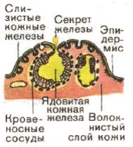 Как в верхнем слое, так и во внутреннем у всех земноводных находится очень много железок различной величины и различного назначения. Наиболее интересны ядовитые железы. Они расположены в нижнем слое кожи, имеют шаровидную или овальную форму, выделяют слизистую жидкость, в которой находится ядовитое вещество. Амфибии, у которых более развиты такие железы, могут произвольно увеличивать выделения секрета этих желез, и употребляют как средство защиты. В настоящее время установлено, что яды некоторых земноводных очень сильны, но для человека и крупных животных не опасны, потому что содержаться в слизи лишь в незначительной примеси. Однако этот яд может быть смертелен для многих животных. Впрыскивание яда жаб в кровь маленьких птиц быстро убивает их; точно так же ядовитая слизь жаб, введённая в кровь щенят, морских свинок, лягушек и тритонов, действует смертельно. У некоторых жаб, а в особенности саламандр, очень развиты слизистые железы, из которых они могут произвольно вызывать обильное выделение, даже брызжут каплями ядовитой жидкости, именно с этим связано народное поверье, будто саламандра не горит в огне.