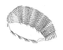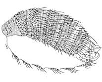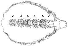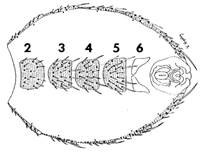 самца - шесть, причём шестой и восьмой тергиты слиты, а восьмой вошёл в состав полового аппарата. Стерниты- такие же хитиновые пластинки с брюшной стороны (см. рис.). У самки их также на один больше, чем у самца, и у представителей каждого пола не развиты первый, второй, седьмой и восьмой стерниты.
