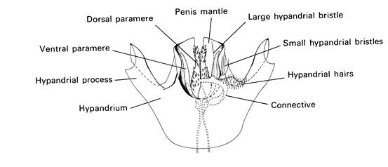 Наружные половые органы самца имеют более сложное строение. Они состоят из генитальной пластинки и пениса с прилегающими к нему частями. Генитальная пластинка представляет собой подковообразное хитиновое образование. Внутри неё открывается анальное отверстие, по бокам которого латерально расположены две анальные пластинки. С брюшной стороны генитальная пластинка несёт две пары отростков, к которым причленяется пенис с его придатками. Собственно пенис имеет вид ложкообразной хитиновой пластинки, несущей краю ряд хитиновых зубцов: