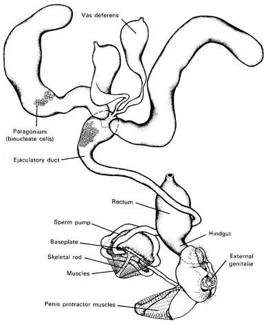 Внутренний половой аппарат самца включает в себя парный семенник, парные семенные пузырьки, придаточные железы, непарный семявыносящий проток, непарный bulbus ejaculatorius, непарный семяизвергательный канал. Семенники представляют собой свёрнутые трубки, переходящие в семенные пузырьки, которые переходят в семенные канальца, соединяющиеся непосредственно перед впадением в семявыносящий проток. Семявыносящий проток впадает в bulbus ejaculatorius, который играет роль насоса, выталкивающего сперму из семявыносящего протока и выбрасывающего её наружу через семяизвергательный канал, который открывается в основание пениса.