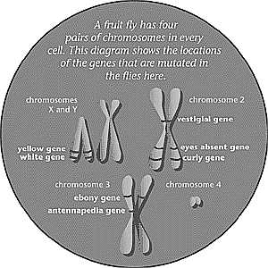Дрозофила имеет четыре пары хромосом: X/Y - половые хромосомы и аутосомы 2, 3 и 4. Четвёртая хромосома достаточно маленькая и редко упоминается. Размер генома мухи составляет около 165 миллионов оснований и содержит, по приблизительным подсчётам, 14.000 генов (для сравнения, геном человека имеет 3.300 миллионов оснований и около 70.000 генов, дрожжи имеют около 5800 генов в 13.5 миллионах оснований).