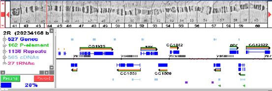 Стандартная карта политенной хромосомы разделяет геном на 102 пронумерованные полоски (1-20 - X-хромосома, 21-60 - вторая хромосома, 61-100 - третья и 101-102 - четвёртая); каждая из полосок поделена на 6 буквенных полосок (A-F), и каждая из пронумерованных полосок также поделена на несколько (до 13) подразделов. На фотографии выше указана 57-я полоска. Локализация многих генов известна точно по буквенной шкале, но не точно по цифровой шкале, и поэтому указывается приблизительно (например, 42C7-9, 60A1-2). Политенные полоски не имеют одинаковой длины последовательности нуклеотидов, но в среднем одна буквенная полоска содержит около 300kb ДНК, или 15-25 генов.