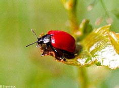 Врагом тлей является наша обычная семиточечная коровка (Coccinella septempunctata, табл. 39, 30), имеющая на красных надкрыльях семь черных точек. Снизу жук черный, его передyеcпинка также черная с двумя белыми пятнами (см. фото). Зимуют взрослые жуки, и уже в первые теплые дни они пробуждаются от оцепенения и приступают к поискам зарождающихся колоний тлей. Их серые с красными точками личинки очень прожорливы, для полного развития им необходимо около 1000 тлей, причем дневной рацион взрослой личинки состоит из 60 —100 взрослых тлей или 300 личинок. Семиточечная коровка встречается в течение всего лета, а осенью жуки отправляются па зимовку. Руководствуясь запахом, они слетаются вместе и образуют крупные скопления в листве на опушках леса или под камнями в горах, обычно на южных прогреваемых склонах. Образ жизни большинства кокцинеллид сходен.
