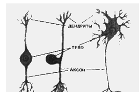 Нейрон состоит из тела и отростков. Различают два типа отростков: дендриты и аксоны . Отростки могут быть длинными и короткими.
