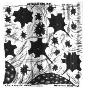 Клетки-спутники окружают нейроны, выполняя питательную, опорную и защитную функции. Клеток –спутников примерно в 10 раз больше, чем нейронов.