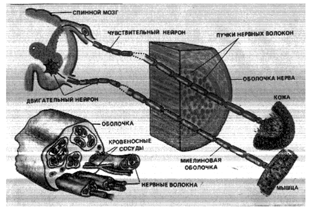 Нервы – скопления длинных отростков нервных клеток, покрытых оболочкой. Нервы, состоящие из аксонов двигательных нейронов, называются двигательными нервами . Чувствительные нервы состоят из дендритов чувствительных нейронов. Большинство нервов содержат и аксоны и детриты. Такие нервы называют смешанными. По ним импульсы идут по двум направлениям – к центральной нервной системе и от нее к органам.