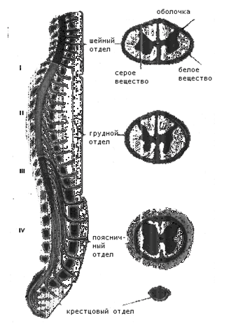 Центральная часть спинного мозга образована серым веществом, которое состоит из вставочных и двигательных нейронов. Вокруг серого вещества расположено белое вещество, образовано длинными отростками нейронов. Они направляются вверх или вниз вдоль спинного мозга, образуя восходящие и нисходящие проводящие пути.