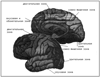 Значение коры больших полушарий. В коре больших полушарий различают чувствительные и двигательные зоны. В чувствительные зоны поступают импульсы от органов чувств, кожи, внутренних органов, мышц, сухожилий. При возбуждении нейронов чувствительных зон возникают ощущения. В коре затылочной доли находится зрительная зона. Нормальное зрение возможно, когда этот участок коры не поврежден. В височной зоне находится слуховая зона. При ее повреждении человек перестает различать звуки. В участке коры за центральной бороздой располагается зона кожно-мышечной чувствительности. Кроме того, в коре больших полушарий выделяют зоны вкусовой и обонятельной чувствительности. Перед центральной бороздой находится двигательная зона коры. Возбуждение нейронов этой зоны обеспечивает произвольные движения человека. Кора функционирует как единое целое и является материальной основой психической деятельности человека. Такие специфические психические функции, как память, речь, мышление и регуляция поведения, связаны с корой больших полушарий.