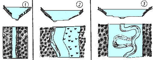 Долина реки (русло, пойма и коренные берега), поперечный разрез и вид сверху: 1) верховье — так называемая зона форели; 2) среднее течение — зона хариуса; 3) низовье со старицей — зона леща