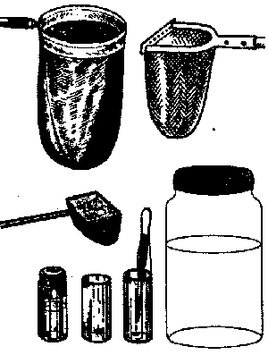Порядок разбора. Вывалите содержимое сачка или скребка в таз с водой для разбора улова. Пинцетом, а особо вертких животных — маленьким сачком или резиновой грушей со стеклянной трубкой рассадите, сортируя, по банкам с водой. Воду нужно брать с места отлова. Мелких животных поместите в пробирки. Банок и пробирок должно быть достаточно, чтобы не смешивать хищников с жертвами, крупных и твердых животных с мелкими и хрупкими. Совсем нежных животных (гидра, губка, мшанка), а также кладки икры и яиц в слизистых коконах вырезайте и сохраняйте вместе с субстратом (стеблями, листьями).