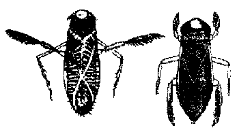 Клопы - полужесткокрылые собственнно, или разнокрылые (Hemiptera genuina s. Heteroptera), составляют подотряд полужесткокрылых или хоботных насекомых (Rhynchota s. Hemiptera). Передние крылья наполовину жесткие, наполовину перепончатые, задние целиком перепончатые, редко пер. крылья мягкие сетчатые, в покое складываются горизонтально на спине. Нередко у индивидов одного вида встречаются значительные колебания в степени развития крыльев (у одних хорошо развиты, у других укорочены); часто это относится к самкам, а самцы снабжены хорошо развитыми крыльями. Хоботок свободный и прикреплен к нижней и передней части головы, усики 4 - 5 члениковые, первый членик груди большой и свободный, лапки обыкновенно 3-члениковые. Многие издают отвратительный запах. Некоторые питаются соками растений, другие хищны или временные паразиты животных. Некоторые К. полезны истреблением вредных насекомых, яйца некоторых видов Соriха употребляются в пищу, другие вредят растениям или полезным животным (напр., гладыши истребляют молодых рыбок), некоторые - временные паразиты человека и домашних животных и причиняют боль и опухоль своим укушением, которое может даже быть опасным (очень сильную боль причиняет, напр., укушение тропических Arieus и европейского Reduoius). Добычу хищные К. убивают уколом щетинок хоботка, причем в раны вливается едкая жидкость. К. разделяются на наземных (Geo cores) и водяных (Hydrocores). Н. Кн.