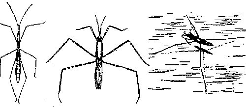 Водомерки — изящные хищники спокойных водоемов. Слева: палочковидная медлительная водомерка Hydrometra gracilenta — ходит по воде. Справа: водомерки семейства Gerridae — быстро скользят по воде |