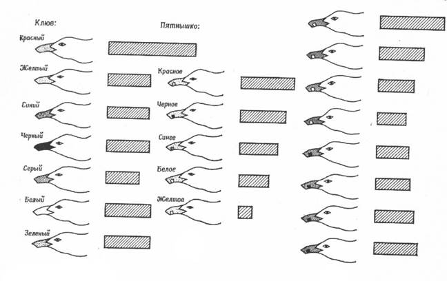Один из самых интересных вопросов, связанных с пищевым поведением птенцов - это вопрос о том, как птенцы узнают своих родителей. Наблюдения за развитием птенцов в естественных условиях показали, что птенцы иногда клюют не только клюв взрослой птицы, но и иные предметы, в том числе другие части тела родителя. Правда, большинство клевков все же нацелено на клюв, особенно в более позднем возрасте. Это позволяет предположить, что недавно вылупившиеся птенцы представляют себе родителей довольно смутно, но с возрастом, по мере накопления опыта, образ взрослой птицы становится у них все более четким. Эту проблему исследовали с помощью набора различных моделей головы и клюва (на рисунке показаны модели и относительная частота ударов по ним клювом).