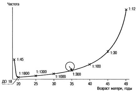 С возрастом существенно возрастает вероятность рождения детей с синдромом Дауна. Так, в возрасте 45 лет она составляет около 3%. Высокая частота детей с синдромом Дауна (около 2%) наблюдается у рано рожающих женщин (до 18 лет). Следовательно, для популяционных сравнений частоты рождения дедетей с синдромом Дауна надо принимать во внимание распределение рожающих женщин по возрасту (доля женщин, рожающих после 30—35 лет, среди всех рожающих). Это распределение меняется иногда в течение 2—3 лет для одного и того же населения (например, при резком изменении экономической ситуации в стране). В связи с уменьшением в 2 раза числа женщин, рожающих после 35 лет, в последние 15 лет в Белоруссии и России число детей с синдромом Дауна снизилось на 17—20%. Увеличение частоты с увеличением материнского возраста известно, но в то же время необходимо понимать, что большинство детей с синдромом Дауна рождены матерями, возраст которых младше 30 лет. Это связано с большим числом беременностей в этой возрастной группе по сравнению со старшей группой.