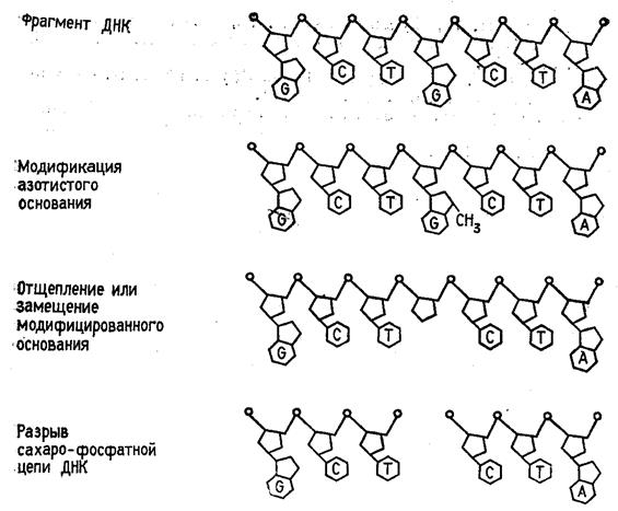 Быстрый прогресс, наблюдавшийся в последние годы в различных областях молекулярной биологии, во многом обусловлен появлением эффективного метода определения первичной структуры ДНК. Этот метод, предложенный в 1977 г. Максамом и Гилбертом, основан на селективной химической модификации различных типов гетероциклических оснований в составе ДНК с последующим расщеплением межнуклеотидных связей в модифицированных звеньях. Реакции селективной модификации по каждому типу гетероциклических оснований проводятся таким образом, чтобы в каждой молекуле ДНК в среднем модифицировалось только одно звено данного типа. Поскольку все звенья данного типа в составе молекулы эквивалентны и реагируют с модифицирующим агентом с одинаковыми скоростями, то в сумме каждое звено этого типа окажется частично модифицированным. Дальнейшая обработка ДНК вторичным амином или щелочью приводит к отщеплению модифицированных гетероциклических оснований от цепи ДНК и разрыву полинуклеотидной цепи в местах отщепления гетероциклов (рис. 1).