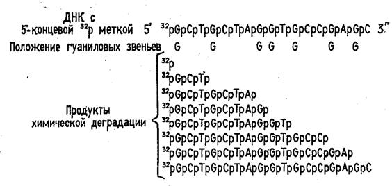 Р-АТР и Т4-полинуклеотидкиназы. Таким образом, в результате химической деградации получается набор фрагментов ДНК различной длины. Длины этих фрагментов соответствуют положению мономерных звеньев того типа, который подвергался модификации. Концевая радиоактивная метка служит точкой отсчета при определении длины продуктов химической деградации ДНК (рис. 2)