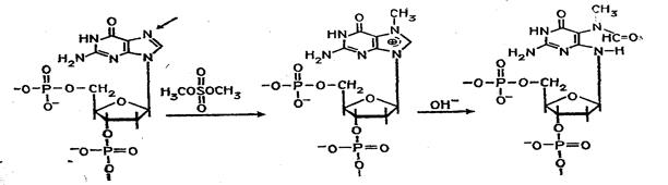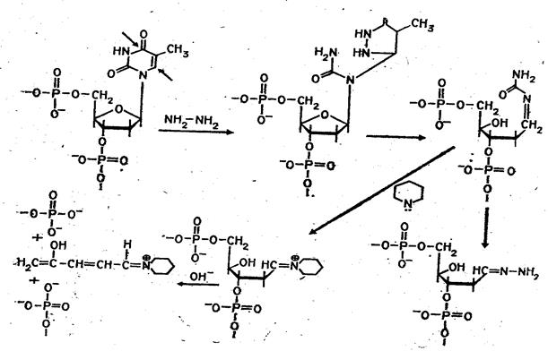 Набор реакций, применяемых для расщепления ДНК по мономерным звеньям определенного типа достаточно велик и постоянно пополняется: по остаткам гуанина – обработка диметилсульфатом (рис. 3); по остаткам аденина и гуанина – апуринизация 50%-ной муравьиной кислотой (по Бартону); по остаткам аденина и цитозина – расщепление гетероциклических оснований под действием 1,2 н. гидроксида натрия и по остаткам тимидина и цитозина – обработка гидразином (рис. 4).