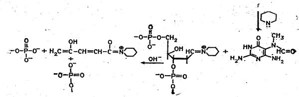 Рисунок 1.1 Отщепление модифицированных звеньев от цепи ДНК после обработки вторичным амином или щелочью.