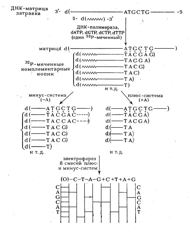 Р-меченных олигонуклеотидов различной длины в виде комплексов с матричным полинуклеотидом подвергают гель-фильтрации для удаления дезоксирибонуклеозид-5'-трифосфатов и аликвоты реакционной смеси реинкубируют с ДНК-полимеразой в различных условиях. В случае "минус-системы" реинкубацию проводят в присутствии только трех дезоксирибонуклеозид-5'-три-фосфатов. Например, в «- А-системе» отсутствует dATP и каждая копия в смеси достраивается с помощью ДНК-полимеразы до места, в котором следующим мономерным звеном должен быть остаток pdA (т.е. Т в матричном полинуклеотиде). Образующуюся смесь фракционируют с помощью электрофореза и обнаруживают (ауторадиографически) ограниченное количество полос (их количество равно количеству Т в матричном полинуклеотиде). Аналогично проводят копирование в отсутствие других субстратов: - dGTP, - dCTP или - dTTP (- G-,- С- и - Т-системы соответственно). Все четыре ионофореза проводят в полиакриламидном геле параллельно. Полученные ауторадиограммы позволяют сразу написать нуклеотидную последовательность, причем чтение цепи снизу вверх соответствует 5'