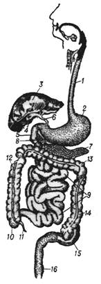 15—сигмовидна ободова кишка; 16— пряма кишка.