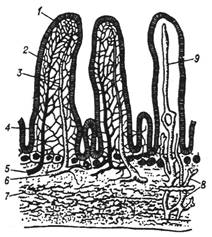 Рис. 1.4. Будова стінки тонкої кишки (схема): 1 — епітеліальна стінка ворсинки; 2 — вена; 3 — артерія ворсинки; 4 — кишкова залоза; 5 — вена; б — артерія кишкової стінки; 7 — м'язова оболонка кишки; 8 — лімфатичні судини; 9 — центральна лімфатична судина ворсинки. |