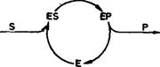 В этом процессе участвуют по меньшей мере три интермедиата: свободный фермент (Е), комплекс фермент — субстрат (ES) и комплекс фермент — продукт (ЕР). Схема показывает, что каталитическое действие фермента эквивалентно циклическому воспроизведению интермедиатов при превращении субстрата (S) в продукт (Р). Впрочем, она дает лишь формальное представление истинного процесса, который может включать в себя многоступенчатую активацию субстрата и индуцированные конформационные изменения фермента.