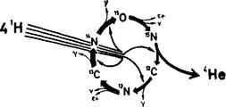 Его компоненты — 12 С, 13 N, 13 С, 14 N, 15 0 и l 5 N — постоянно воспроизводятся в ходе реакционного цикла. Циклическая схема в целом представляет собой катализатор, который превращает четыре атома 'Н в один атом 4 Не с высвобождением энергии в виде Y позитронов (е+) и нейтрино (v).