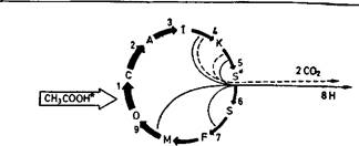 Полная схема цикла была предложена Кребсом, важный вклад в ее построение был внесен также Сеит-Дьёрди, Марциусом и Кнопом. Основные компоненты цикла? цитрат (С), чисаконитат (А), изоцитрат (I), а-кетоглутарат (К), сукцинил-СоА (S*), сукцинат (S), фумарат (F), 1-ма-лат (М) и оксалоацетат (О). Ацетат вступает в цикл в активированной форме в виде ацетил-СоА (этап 1) и реагирует с оксалоацетатом и Н2 0 с образованием цитрата (С) и СоА (+Н+). Во всех превращениях участвуют ферменты и такие кофакторы, как СоА (этапы 1, 5, 6), Fes + (этапы 2, 3), NAD+ (этапы 4,5,9), ТПФ, липоевая кислота (этап 5) и FAD (этап 7). На схеме не показаны дополнительные реагенты: Н2 0 (этапы 1, 3, 8), Pt и QDP (этап 6) и продукты реакций — Н2 0 (этап 2), Н+ (этапы 1, 9) и QTP (этап 6). В результате всех реакций цикла происходит полное окисление двух ацетильных углеродов до CQ2 (и Н2 0). За одни оборот цикла генерируется 12 макроэргических фосфатных связей, причем одна из них образуется в самом цикле (QTP, этап 6), а 11—в результате окисления NADH и FADH2 [три пары электронов переносятся к NAD+ (этапы 4, 5,9) и одна пара — к FAD (этап 7)].