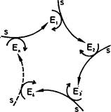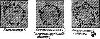Компоненты цикла сами являются катализаторами, которые образуются из каких-либо высокоэнергетическнх субстратов (S), причем каждый интермедиат является катализатором для образования E+i. Каталитический цикл в целом эквивалентен автокатализатору, инструктирующему свое собственное воспроизведение. Для существования каталитического цикла достаточно, чтобы одни из интермедиатов был катализатором для одной из последующих реакций.