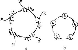 В качестве автокатализатора или — в более общем случае—в качестве каталитического цикла ннтермедиат Uспособен инструктировать свое собственное воспроизведение, а кроме того, он оказывает каталитическое содействие воспроизведению следующего интермедиата (с использованием высокоэнергетичеекого строительного материала X). Упрощенная схема (Б) показывает иерархию циклов.