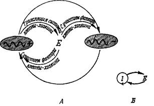 Инфекционная плюс-цепь, используя аппарат трансляции клетки-хозяина, сначала инструктирует синтез белковой субъединицы (Е), которая связывается с другими белками клетки-хозяииа с образованием фагоспецифичной РНК-репликазы. Этот репликазный комплекс узнает только определенные фенотипические особенности фаговой РНК, которые имеются как у плюс-, так и у минус-цепи благодаря симметрии определенных участков цепи РНК. В результате происходит вспышка синтеза фаговой РНК, которая — из-за гиперциклической природы — носит гиперболический характер (см. часть Б, рис. 17), пока не наступит насыщение по одному из интермедиатов или пока не истощатся запасы метаболитов клетки-хозяина. Схема Б показывает, что автокаталитическими илк самоинструктивиыми свойствами может обладать всего один из интермедиатов при условии, что другие «партнеры» связаны с ним с помощью циклической обратной связи.